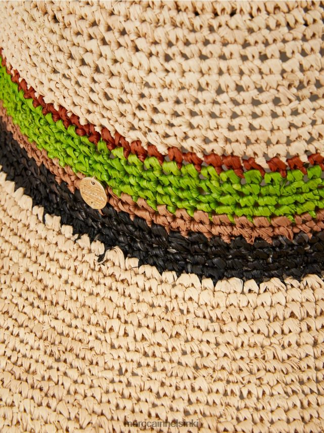 Marc Cain -kokoelmat Hat -kaista korvataan kudotulla raidalla vastakkaisella värillä. Tämä esine on valmistettu luonnollisesta olkista.
