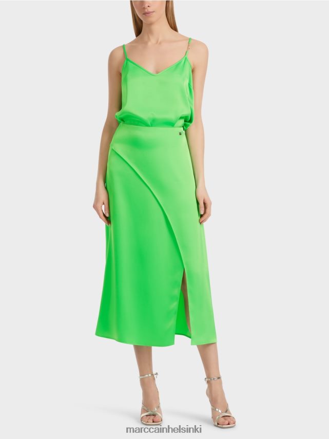 Marc Cain -kokoelmat Puolipyöreällä käärevaikutuksellaan tämä hame ilmentää rentouttavaa hohtoa. Koska tämä luo kätevän kävelyrakoon edessä. Hame leikataan lähellä kuviota ja midi -pituutta. Piilotettu vetoketju varmistaa mukavan kastikkeen ja riisuutumisen.