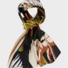 Marc Cain -kokoelmat Suunnittelussa on kollaasi tyyliteltyistä trooppisista lehtimaksuista ja eläinten turkista. Reunat on täytetty sivuilla ja reunustavat päissä.