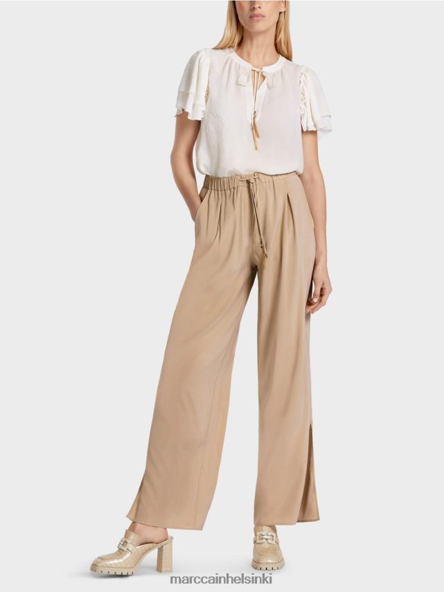 Marc Cain -kokoelmat Ne ovat joustavia vyötäröllä ja niillä on vyötärölaskos. Jalan rento leveys korostaa vierekkäin. silmiinpistävä ominaisuus ovat koristeelliset elementit kirjaa.