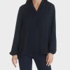 komplikaatio, joka on valmistettu virtaavasta, hiukan hohtavasta mikrokuidun laadusta, pitkät hihat. Leveä pusero on koristeltu pääntiellä kaksinkertaistuneilla ja leikattuilla flount -reunoilla, jotka antavat mallille naisellisen ilmeen. Mansettiin sisällytetään joustava nauha.