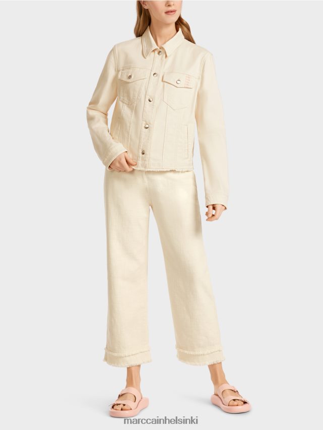 urheilullinen takki puuvillalla elastaanilla. Tällä farkkutakilla on kesäinen tunne “Apres Beach” -lausunnossaan ja kukkapainatuksella takana. Tyypillisiä elementtejä ovat läpän rintataskut ja kaksi sivutaskua. Metallipainikkeet ja kaksinkertainen ompeleminen täydentävät farkkutyyliä, kun taas karkotettu helma täydentää mallia satunnaisesti.