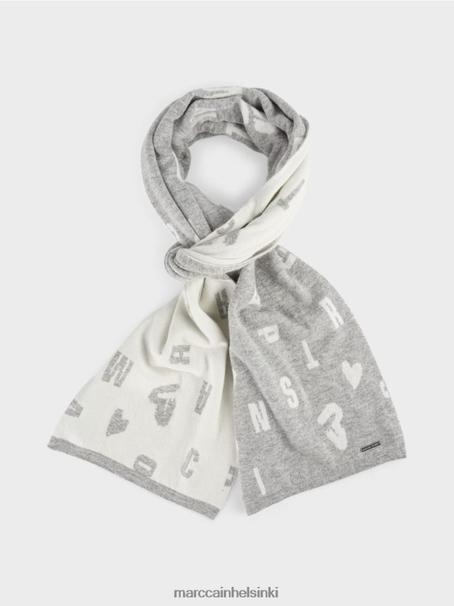 Huivi on valmistettu pehmoisesta langasta, jossa on kashmir -sisältö. Hajotuskuvio on neulottu ja sisältää kuvioita, kuten kirjaimia, sydämiä ja hymiöitä. Tehokas, negatiivinen värisuunnittelu takana. Huivin pitkät reunat ja päät viimeistely sujuvasti.