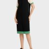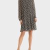 Marc Cain -kokoelmat Tämän mekon geometrinen kuvio on ristiriidassa romanttisen siluetin kanssa. Se herättää ristikkäisen pääntie ja leikkisät röyhelötiedot Ragan -hihoissa, kauluksessa ja helmassa. Smocked vyötärö ja joustavat hihansuut parantavat romanttista tyyliä.