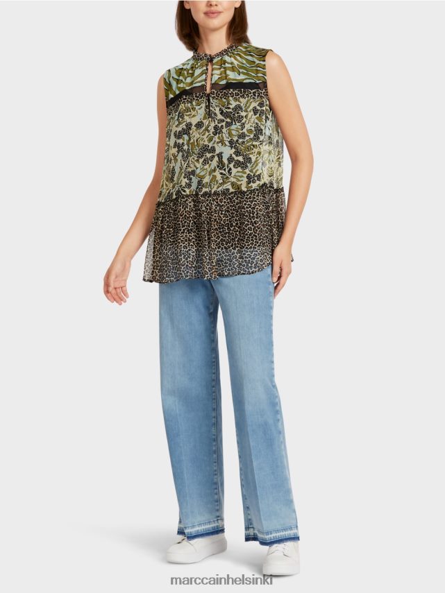 Tämä porrastettu yläosa on valmistettu hienoista viskoosikrepeistä. Mielikuvituksen kuvio on inspiroinut kasvisto- ja eläimistökuvioita. Verkko- ja leoparditulostusraidat lisäävät aksentteja eteen. Stand-up-kaulus on hiukan kerätty ja kiinnittyy napin ja silmukan kanssa.