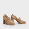 Nämä korkeat pumput esittelevät itselleen peitetyn lohkon kantapään. Ne on valmistettu korkealaatuisesta sileästä nahasta. Metallinen koristeellinen lukko korostaa naisellinen tyyli. Suunnittelu valmistuu neliömuotoisella kärkillä.