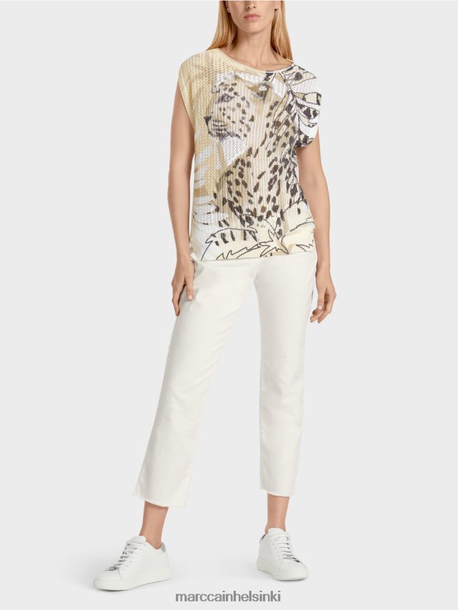 Marc Cain -kokoelmat -Kirainen neulottu kuvio. Etuosa on painettu kollaasimaisella trooppisella kasvistolla ja eläimistöllä. Takaosa on tavallinen. Pusero on 100% valmistettu Saksassa. Se on neulottu ja viimeistelty Saksassa uusimman tekniikan avulla, ja yksittäiset kappaleet, kuten takaosa ja edessä jne., Ommeltetaan yhdessä eurooppalaisten kumppaniyhtiöidemme kanssa.
