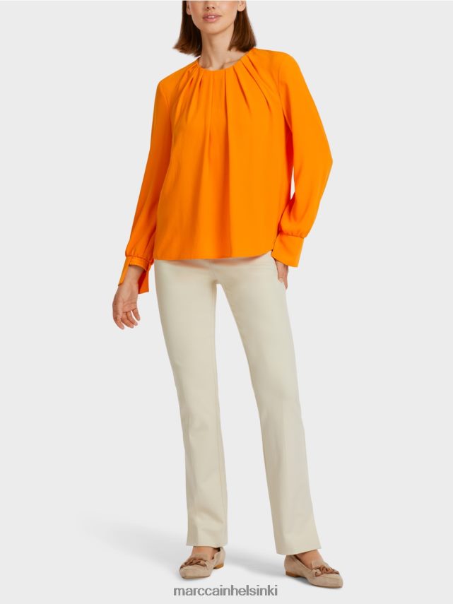 Marc Cain -kokoelmat Laskostettu pyöristetty kaula saa tämän puseron erottumaan joukosta. Leveät hihat, joissa on joustavat ja kiinnitetyt hihansuut, tekevät epätavallisen ominaisuuden. Herkkä painike niskassa lisää tyylikkään mallin.