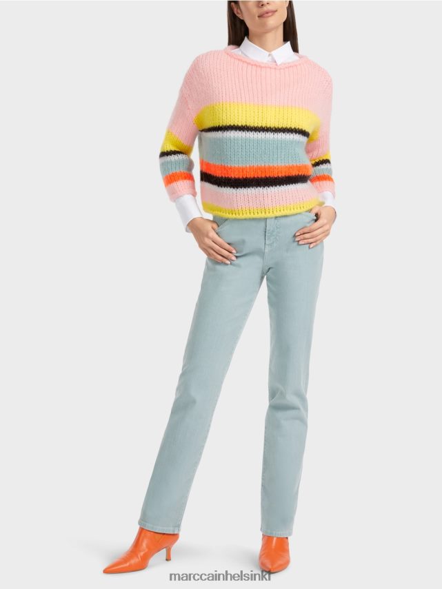 Marc Cain -kokoelmat Tämä pyöreä kaulainen hyppääjä materiaaliseoksesta puuvilla, mohair, alpaka ja villa on neulottu ja valmistettu myös Saksassa sijaitsevassa paikassa. Yksittäisten osien jatkokäsittelyn suorittavat eurooppalaiset kumppaniyhtiöt. Tämä tarkoittaa, että esine on “neulottu Saksassa”.