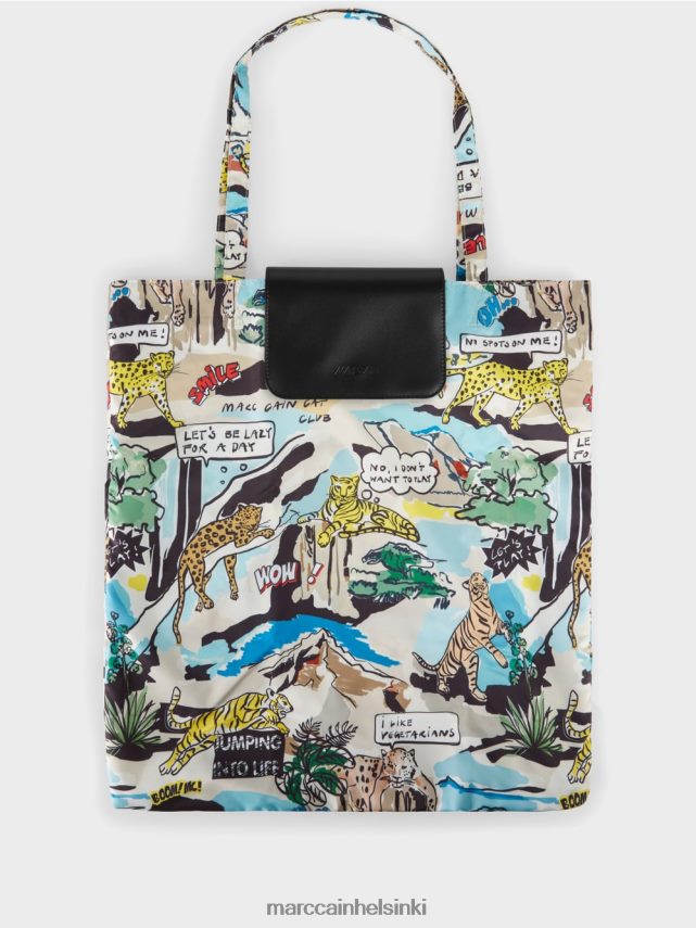 Shopper on valmistettu kierrätetystä polyesteristä ja siinä on “uudelleentarkastelu yhdessä” kestävän kehityksen etiketti. All-Over Print sisältää sarjakuvan aiheen, jossa on 50-luvulla estetiikka. Päähenkilö on Marc Cain Leopard. Ostajalla on pitkittäismuoto eikä syvyyttä. Siinä on pieni pakkaustilavuus ja se sopii jatkuvana seuralaisena jokapäiväisessä elämässä ja matkassa.