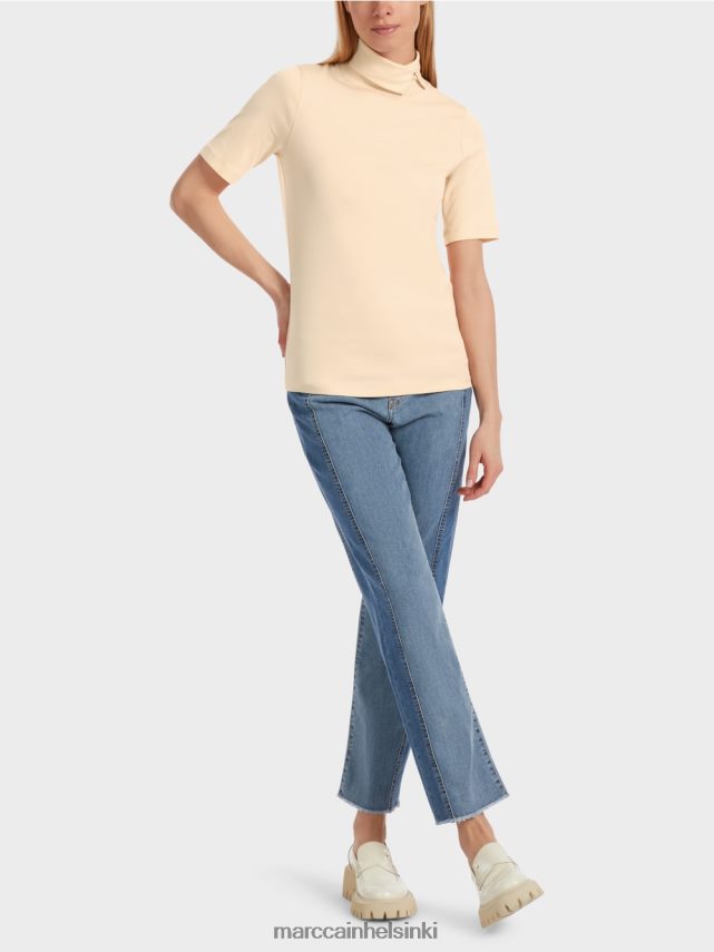 Teema: Tuore mieliala Rullaa kaula koriste -painikkeella. Tyypilliset paitatiedot ovat neljänneksen pituisia hihoja. Yläosa on leikattu lähellä kuvaa ja siinä on Marc Cain -kirje helmassa.