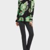 Pusero on valmistettu viskoosin kreppistä ja verhot helposti ja pehmeästi. Leikkaus on ylisuuria – hartiat ovat päällekkäisiä. Kaulus on työskennellyt rakolla ja vedonlyönnin kanssa. Suunnittelulle on ominaista sekoitus tyylejä: tehokkaasti vääristynyt leopardipainatus on ristiriidassa urheilullisten raidallisten hihansuiden kanssa.