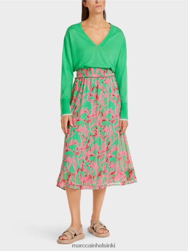 hame kevyesti verhottuun materiaaliin leveällä A-linjan siluetti. Tässä naisellinen midihame sisältää kukkakuvion. Sen porrastetut flounces ovat sen romanttisesti kauniiden ilmeen kohokohdat. Korkea vyötärönauha parit hyvin monimutkaisten smokkien yksityiskohtien kanssa.