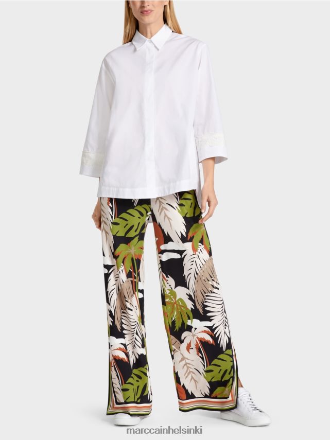 Marc Cain -kokoelmat Siinä on piilotettu nappisuoja, sivulevyt ja hiukan pidempi takaosa. Naisellinen kosketus tulee A -linjasta ja pitsikoristeesta holkin helmassa.