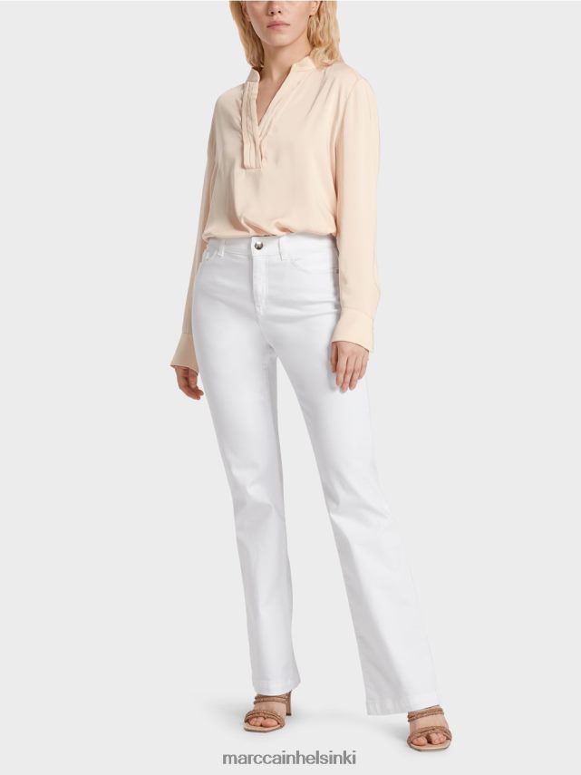 nämä viisitaskut Farkut leikataan lähellä vartaloa ja niillä on hiukan leimahdusjala. Denim on valmistettu 90%: sta puuvillasta. Sekoitus joustavilla kuiduilla antaa sille pehmeän ja joustavan luonteen. Farkut kantavat “uudelleentarkastelun” etiketti.
