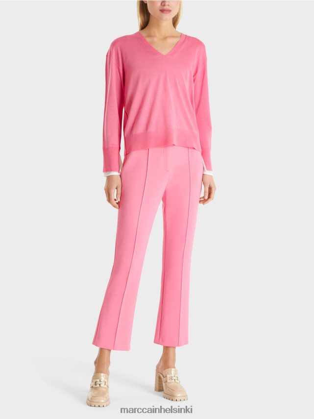 satunnaisesti löysä neulottu villapaita superfinen villalanka. Raja hienovaraisesti kontrastissa kulkee sivusaumoja alas. helma on auki. Hihassa on tyylikäs kerros. Materiaali, joka kurkistaa, luo vaikutelman alla kuluneesta puserosta.