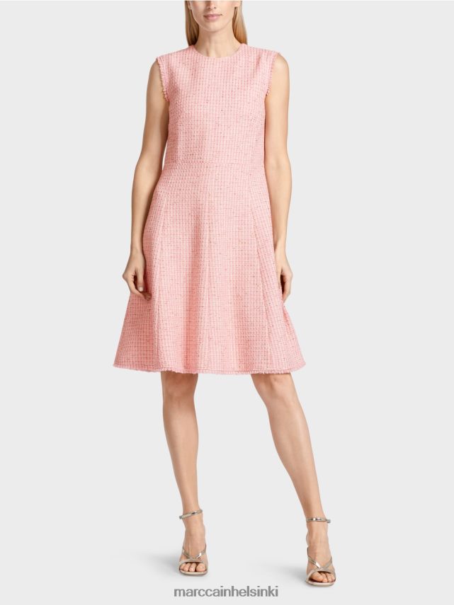 Marc Cain -kokoelmat Sekä materiaalinen rakenne että suunnittelu Hark takaisin tähän aikaan. Yläosa on muotoiltu prinsessa -saumoilla, jotka siirtyvät leveisiin heilahtelupaneeleihin alaosassa. Mekko kiinnitetään takaosaan saumalla vetoketjulla. Hame -helmassa on viileitä reunoja ja käsivarren reikiä.