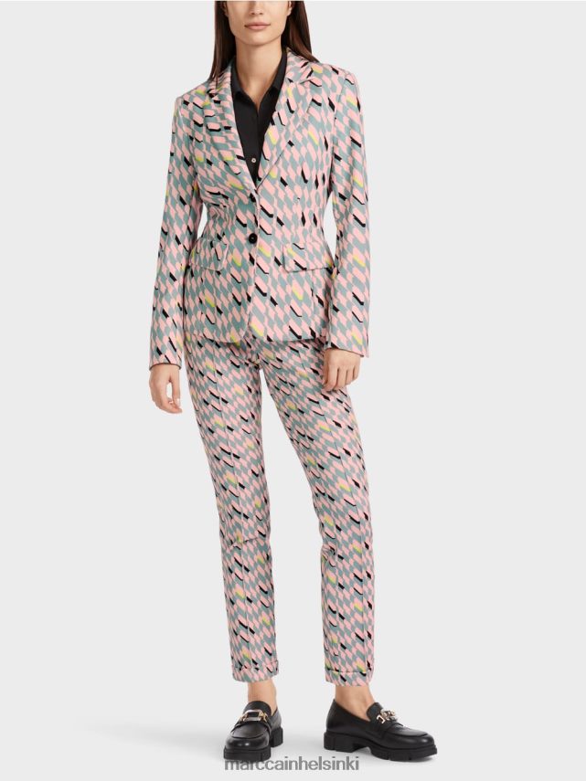 Marc Cain -kokoelmat Sydney näkökulma. Ne on valmistettu joustavasta kangasseoksesta ja niissä on joustava vyötärönauha säännöllisellä korkeudella. Hihansuuntainen helma ja rypyt osoittavat itsensä klassisessa tyylissä. Housut kiinnitetään vetoketjulla ja painikkeella. Mukava yksityiskohta on metallilintujen sisustus vasemmalla puolella.