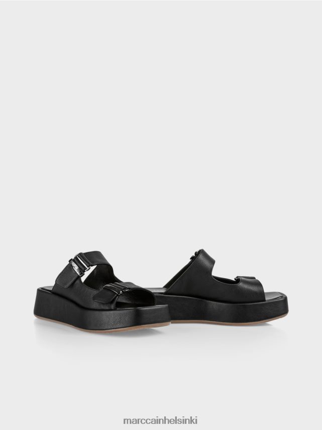 Muodikkaat hihnan sandaalit pienellä alustalla. Näissä tavallisissa sandaalissa on kaksi leveää hihnaa, jotka on koristeltu MC-solkilla. Pehmeä jalkapohja ja kevyt kumipohja logon kirjaimella tekevät niistä mukavia käyttää. Alustapohja on peitetty kaikkialla, hieman leimahtunut ja siinä on neliömuoto.