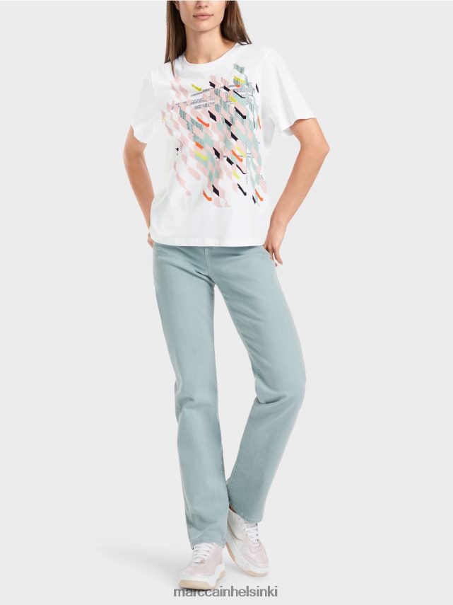 Marc Cain -kokoelmat T-paita on sijoitettu tulostettu värikkäässä graafisessa suunnittelussa ja “tee mitä haluat” -lausekkeella. Vastaavasti yläosa osoittaa itsensä rento siluetti. Lyhyet hihat ja pyöreä kaula täydentävät mallia.