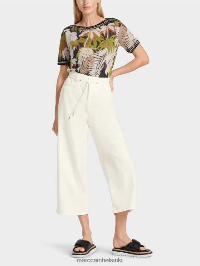 Marc Cain -kokoelmat Tyyli ilmaistaan leveässä jalassa ja innovatiivisessa vyötärönauhasuunnittelussa: hihnan silmukoiden lisäksi on myös vetoketju, jotta housut voidaan käyttää vyöllä tai ilman.
