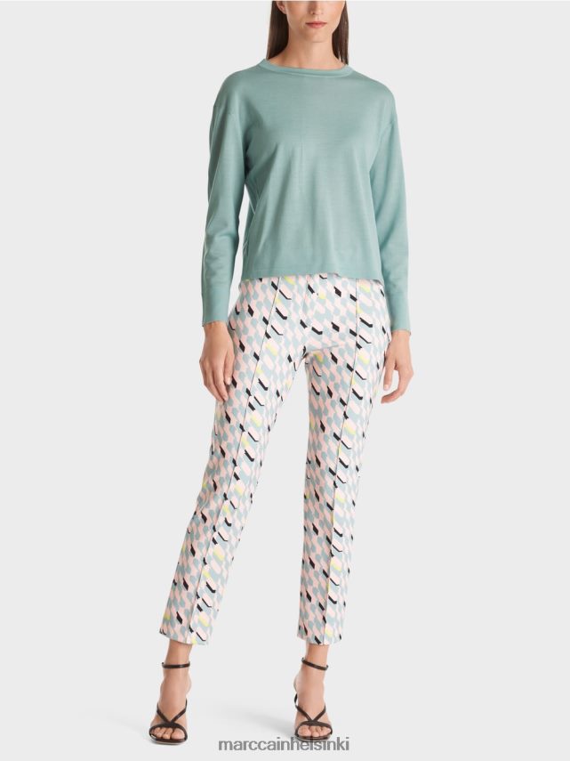 Marc Cain -kokoelmat Tämä villapaita on kevyessä neulomateriaalissa, joka on valmistettu 100% neitsyt villasta. Siinä on pyöreä pääntie ja rako -hihansuut. Pieni, kiiltävä kulta Marc Cain -logo on ommeltu takaosaan naisellinen kosketus.
