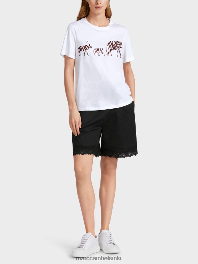 Marc Cain -kokoelmat kestävän kehityksen etiketti. Se on löysä ja siinä on koristeellinen sauma vastakkaisessa värissä sivusaumassa. Edessä on stensifioitu eläinkuvio.