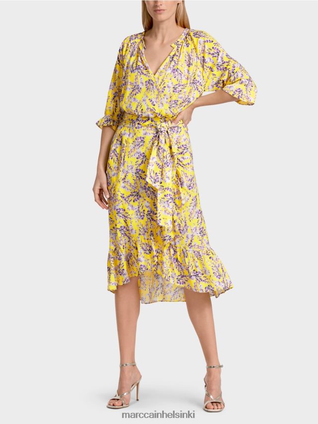 Marc Cain -kokoelmat Se on koottu vyötärön saumaan. Vyötäröä voidaan korostaa käärevyöllä. Mekko on kiinnitetty sivuvetoketjulla ja urheilee ruched -pääntie. Hihat ovat pituudet ja ne on viimeistelty joustavalla helmalla.