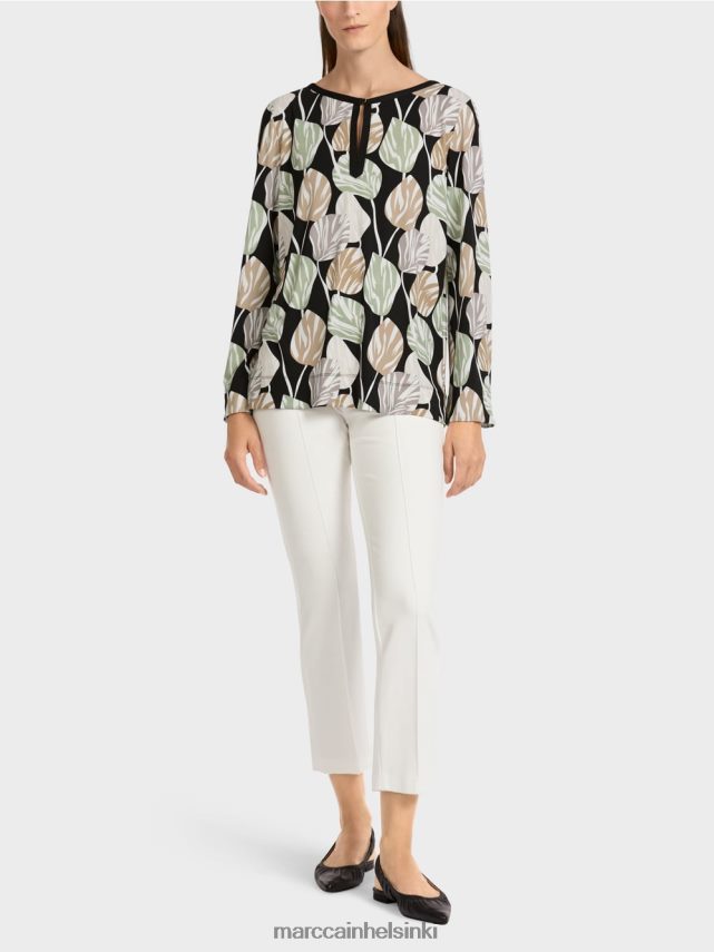 Yksinkertainen leikkaus näyttää silmiinpistävän lehden aiheen täydelliseen vaikutukseen. Leveät helmet korostavat tämän puserotyylisen yläosan rento löysä laatu. Kaulantie mustalla koristeella on herättävän viimeistelyn. Rako on kiinnitetty silmukka ja painike.