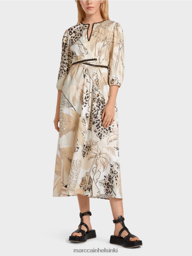 Marc Cain -kokoelmat Leikkaus antaa nyökkäyksen Empire -tyyliin, jonka osoittaa korkea vyötärö ja hiukan kerätyt hihat. Ylimääräinen leveys takana on myös tyypillinen tälle tyylille. Vyötärö on merkitty nauhoilla, jotka on sidottu takaosaan ja koristeltu helmille.