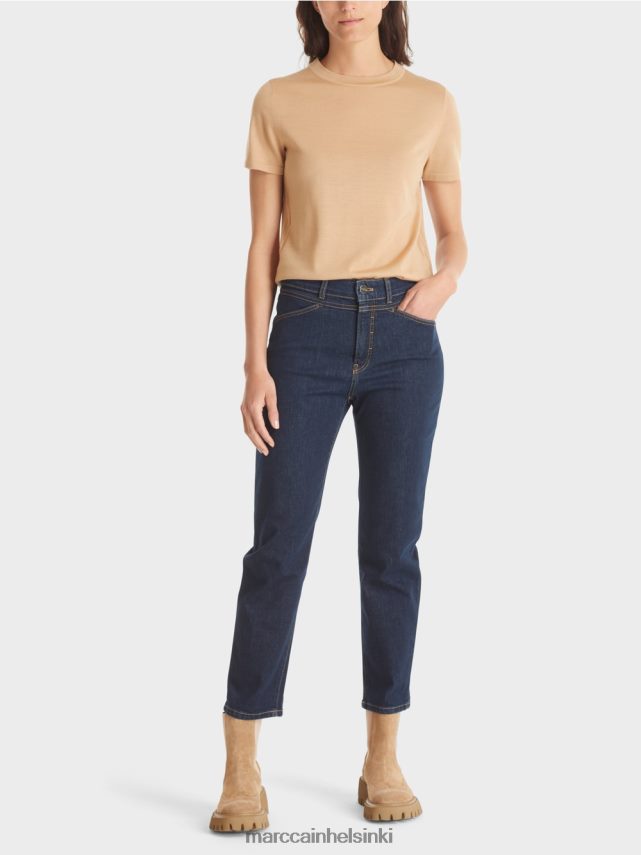 Marc Cain -housut Rikkaassa, elävässä sävyssä, joka on seurausta erityisestä pesusta. Farkut on valmistettu orgaanisella puuvillalla ja kantavat ‘uudelleen’ kestävän kehityksen etiketti. Farkut kiinnittyvät vetoketjulla ja kiiltävällä logo -painikkeella ja ovat vastakkaisia värillisiä ompeleita.