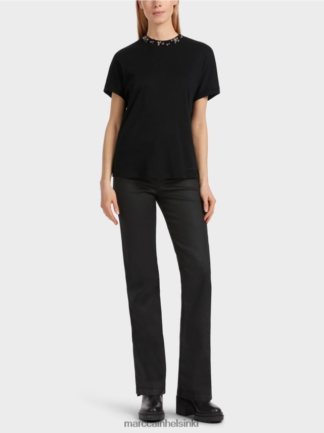 Marc Cain -kokoelmat Tämän t-paidan silmiinpistäjä on stand-up-kauluksen kiiltävä helmen kirjonta. Leikatulla hihoilla malli on yhtä epätavallinen. Suora siluetti tuo annoksen satunnaisuutta tähän naiselliseen yläosaan.