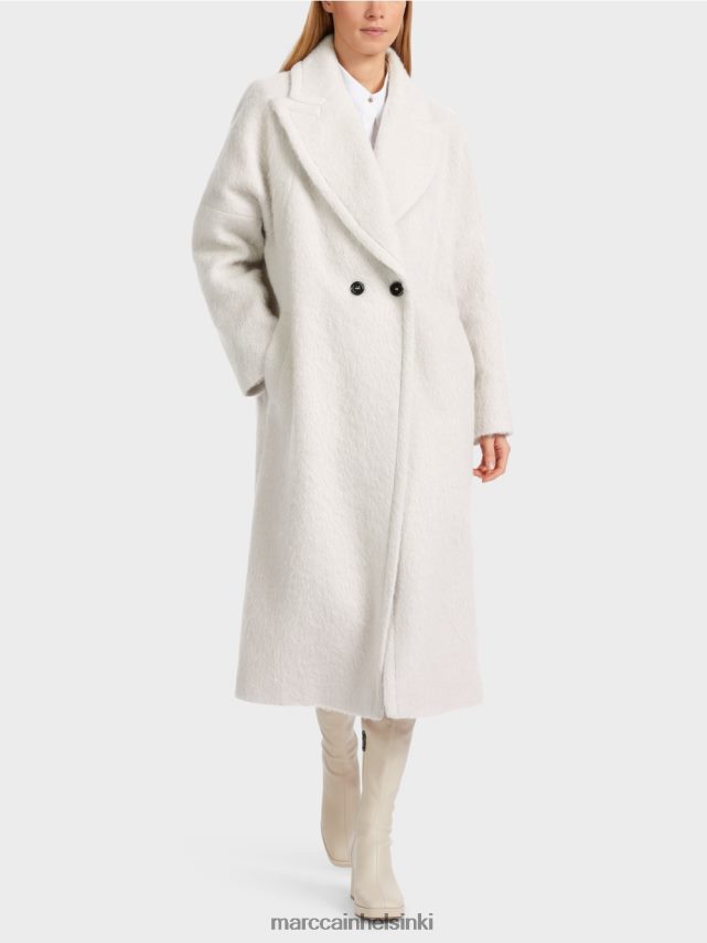Marc Cain -kokoelmat Nousevat läpät, samoin kuin leveät ylikuormitukset korostavat tämän takin satunnaista ylisuuria luonnetta. Valtaiset hitsataskut tarjoavat mukavuutta ja tilaa pienille esineille. Suunniteltu kaksirintaiseksi turkkiin, se kiinnittyy kahteen vastakkaiseen värilliseen painikkeeseen.