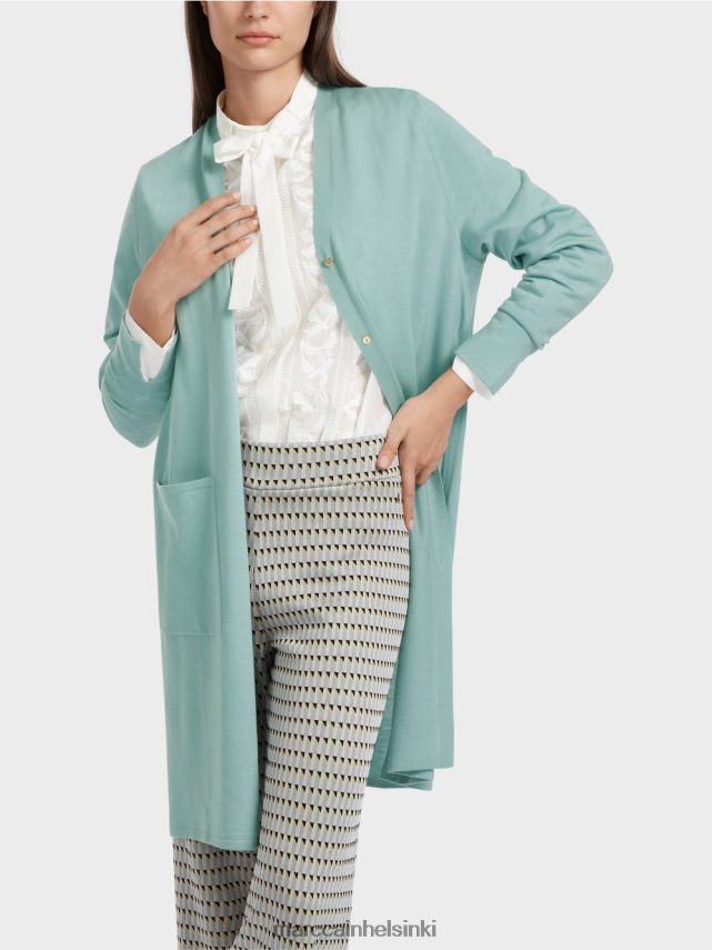 Marc Cain -kokoelmat Materiaalin lisäksi myös tyylikäs kirjonta lintujen suunnittelulla ja leikkisellä kuviolla tekevät tästä puserosta jotain erityistä. Tämän varmistaa myös stand-up-kaulus, jossa on kiinnitetty keula. Täysipitkä painikenkki on piilotettu, ja leveät käsivarren hihansuissa on kaksi kaunista painiketta. Pienet raot sivusaumoissa täydentävät rento leikkaus.