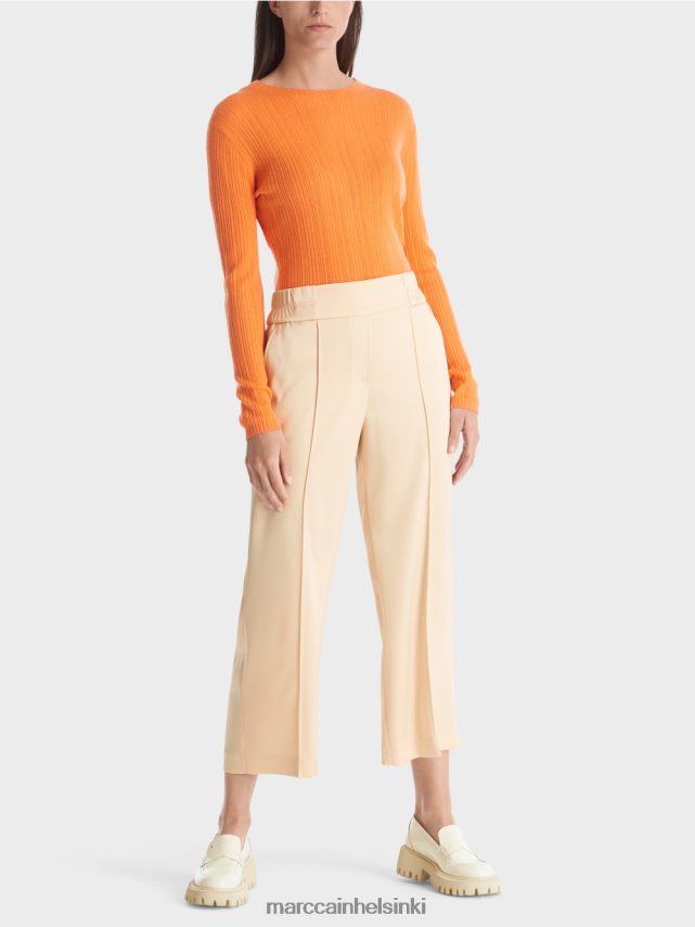 Marc Cain -kokoelmat Washington -housuilla on mukava leveys. Niitä on urheilullinen midi -pituus vastaamaan. Pehmeä virtaava materiaali saa muodonsa rypistä. Joustava vyötärönauha ja kaksi sivutaskua tuovat mukavuuden.