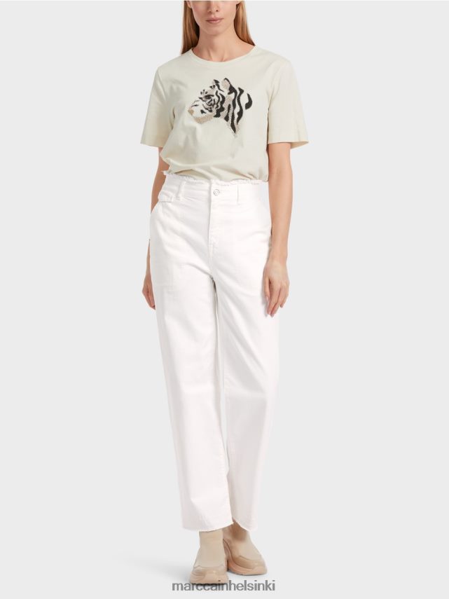 Wuhai -farkkujen suunnittelu perustuu työvaatteisiin. Leikkaus on kapea vyötäröllä, mukava lonkassa ja leveä jalassa. Kohdassa takana on kaksi korjaustaskua. jolloin vasen tasku kantaa Marc Cain -kirjeiden M: n brodeerattuna muodossa. Tyylikkäät yksityiskohdat ovat vyötärönauhan reunan reunat ja HEM: n käytetyt tehosteet. Kohde on valmistettu puuvillasta ja siinä on kestävän kehityksen etiketti “uudelleentarkastelua”.